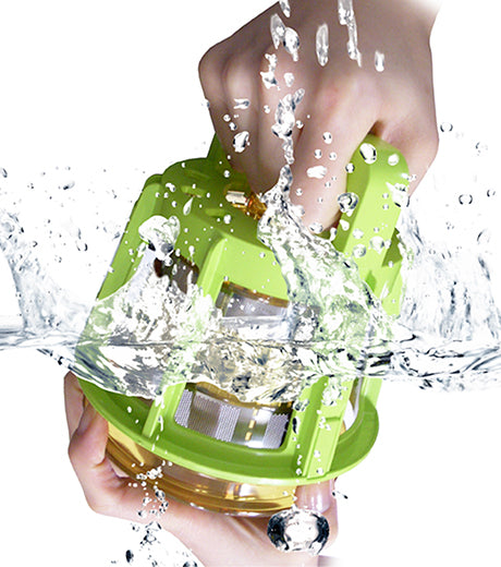 Saftsiebreste lassen sich im Handumdrehen entfernen: Einfach Bürste aufsetzen, gegeneinander drehen – und schon ist alles sauber.