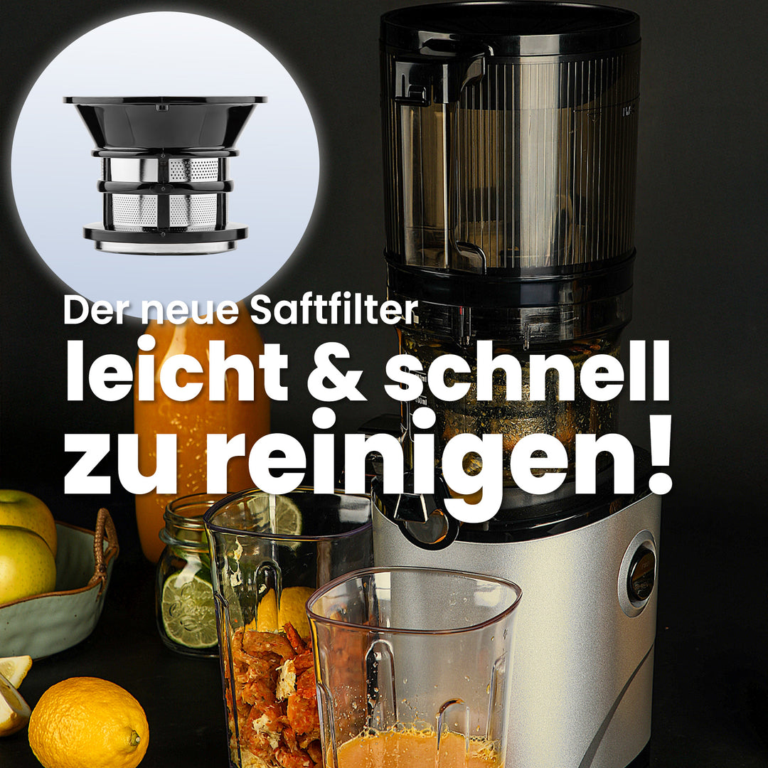 De reinigingsstructuur van de sapzeef is verbeterd om de hoeveelheid vezels die in de zeef achterblijven te minimaliseren. Deze verbetering maakt schoonmaken moeiteloos: even afspoelen onder stromend water is voldoende.