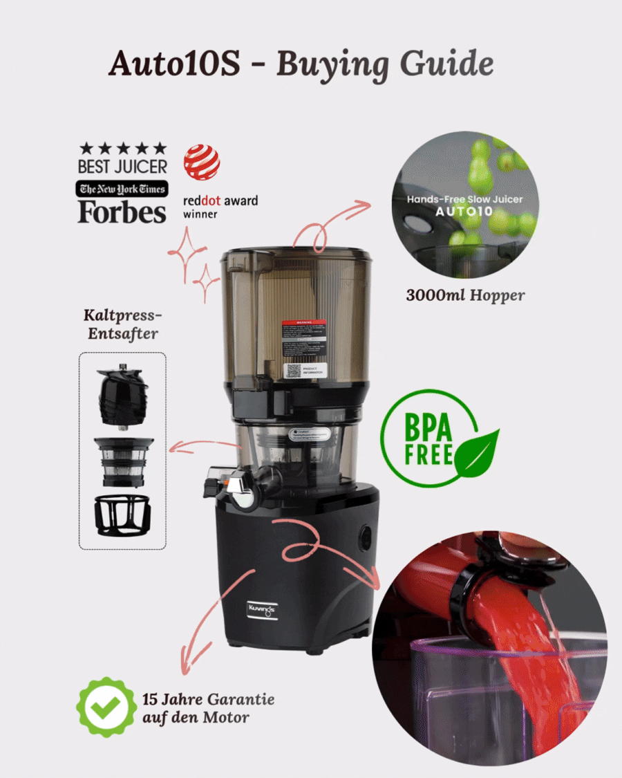 Der Kuvings Slow Juicer ist mehr als nur ein Entsafter – er bringt den natürlichen Geschmack und die wertvollen Nährstoffe von Obst und Gemüse direkt in Ihr Glas. Dank der innovativen Schneckenpresse-Technologie werden Vitamine und Enzyme bewahrt, während die Oxidation auf ein Minimum reduziert wird. Jeder Tropfen Saft spiegelt die Frische und Qualität der Rohstoffe wider und gibt Ihnen das gute Gefühl, Ihrem Körper etwas wirklich Wertvolles zu geben. Ein Unterschied, den Sie schmecken und fühlen können.